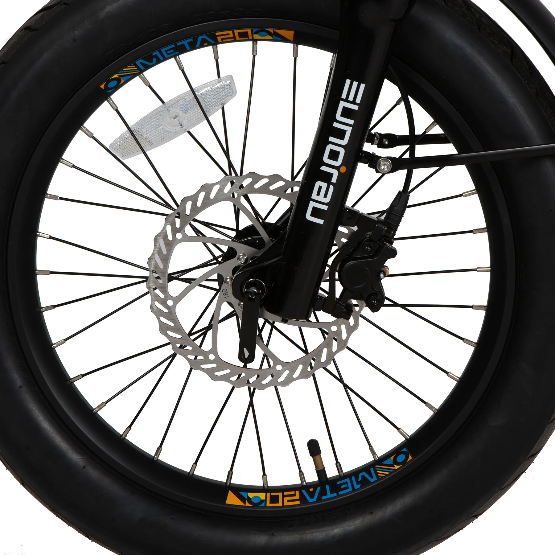 Wide 20-inch Kenda tires give the META20 a more planted feel than a skinny-tire urban bike while keeping the chassis compact.